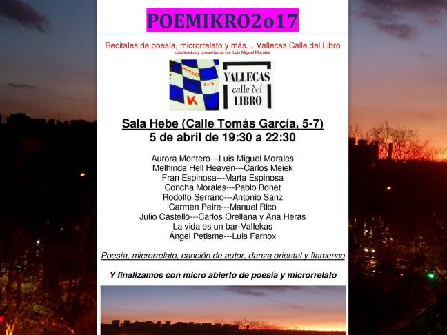 Poemikro 2017 Publicado el 29 marzo, 201729 marzo, 2017 por anuskavk La vida es un bar-Vallekas en Poemikro 2017, dentro de la programación de la XVIII Edición de Vallecas Calle del Libro. Comparte esto: Compartir en X (Se abre en una ventana nueva) X Comparte en Facebook (Se abre en una ventana nueva) Facebook Me gusta Cargando... Relacionado