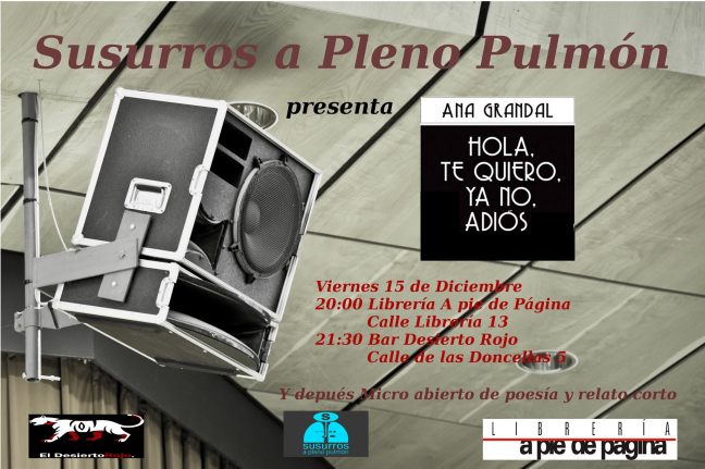 Susurros a pleno pulmón, Valladolid, 15-diciembre-2017 Publicado el 13 diciembre, 2017 por anuskavk Presentación de Hola, te quiero, ya no, adiós. Comparte esto: Haz clic para compartir en X (Se abre en una ventana nueva) X Haz clic para compartir en Facebook (Se abre en una ventana nueva) Facebook Me gusta Cargando... Relacionado
