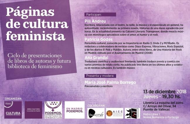 Segunda cita del ciclo Páginas de Cultura Feminista, encuentros periódicos con autoras y con la oportunidad de presentar sus obras y de comunicar sus experiencias como mujeres en el mundo de la literatura, dialogando tanto entre ellas como con los y las asistentes al coloquio. Es una iniciativa que parte del Círculo Podemos Cultura Madrid y del Área de Cultura Madrid y cuenta en esta segunda edición con las Áreas de Feminismo de la Comunidad y de Madrid ciudad.