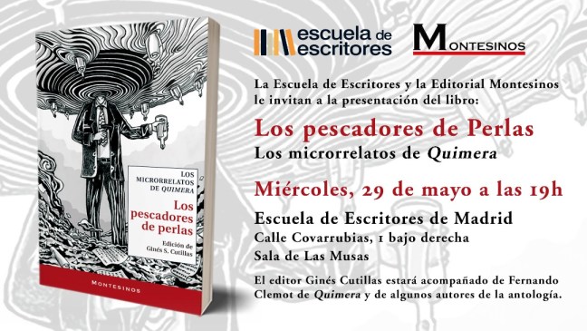 El miércoles 29 de mayo Ginés Cutillas presenta, junto a Fernando Clemot, Los pescadores de perlas (Los microrrelatos de Quimera) en la Escuela de Escritores en Madrid, con la asistencia de más de quince autores de la antología que leerán sus textos: Ernesto Ortega, Rubén Abella, Ana Grandal, Valeria Correa Fiz, Emilio Gavilanes, Alberto Sánchez Argüello,I sabel González, Manu Espada, Paloma Hidalgo, Lorena Escudero, Carmen Peire, Juan Gracia Armendáriz y otros.