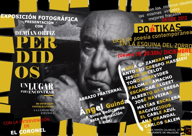 Perdidos en La esquina del zorro Publicado el 19 diciembre, 2019 por anuskavk PERDIDOS, UN LUGAR PARA ENCONTRAR (90 disparos fotográficos a la literatura española), del documentalista gráfico y fotógrafo Demian Ortiz. Me gusta Cargando... Relacionado