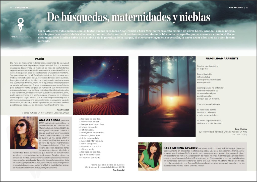 Carta Local, n.º 381, julio/agosto 2024 Publicado el 19 noviembre, 2024 por anuskavk Carta Local, revista de la Federación Española de Municipios y Provincias, publica en cada número textos de autoras de AMEIS (Asociación de Mujeres Escritoras e Ilustradoras). Comparte esto: Haz clic para compartir en X (Se abre en una ventana nueva) X Haz clic para compartir en Facebook (Se abre en una ventana nueva) Facebook Me gusta Cargando... Relacionado