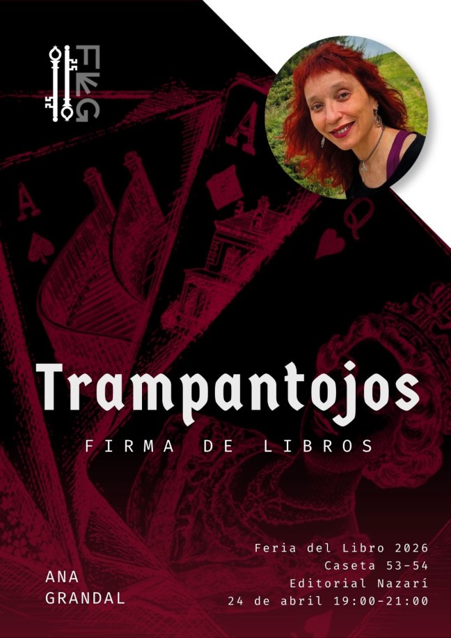 «Trampantojos» en la Feria del Libro de Granada Publicado el 17 abril, 202617 abril, 2026 por anuskavk 24 de abril, 2026, 19:00-21:00 h Ana Grandal firma Trampantojos en la Feria del Libro de Granada, caseta 53-54, Editorial Nazarí. Comparte esto: Compartir en X (Se abre en una ventana nueva) X Comparte en Facebook (Se abre en una ventana nueva) Facebook Me gusta Cargando... Relacionado