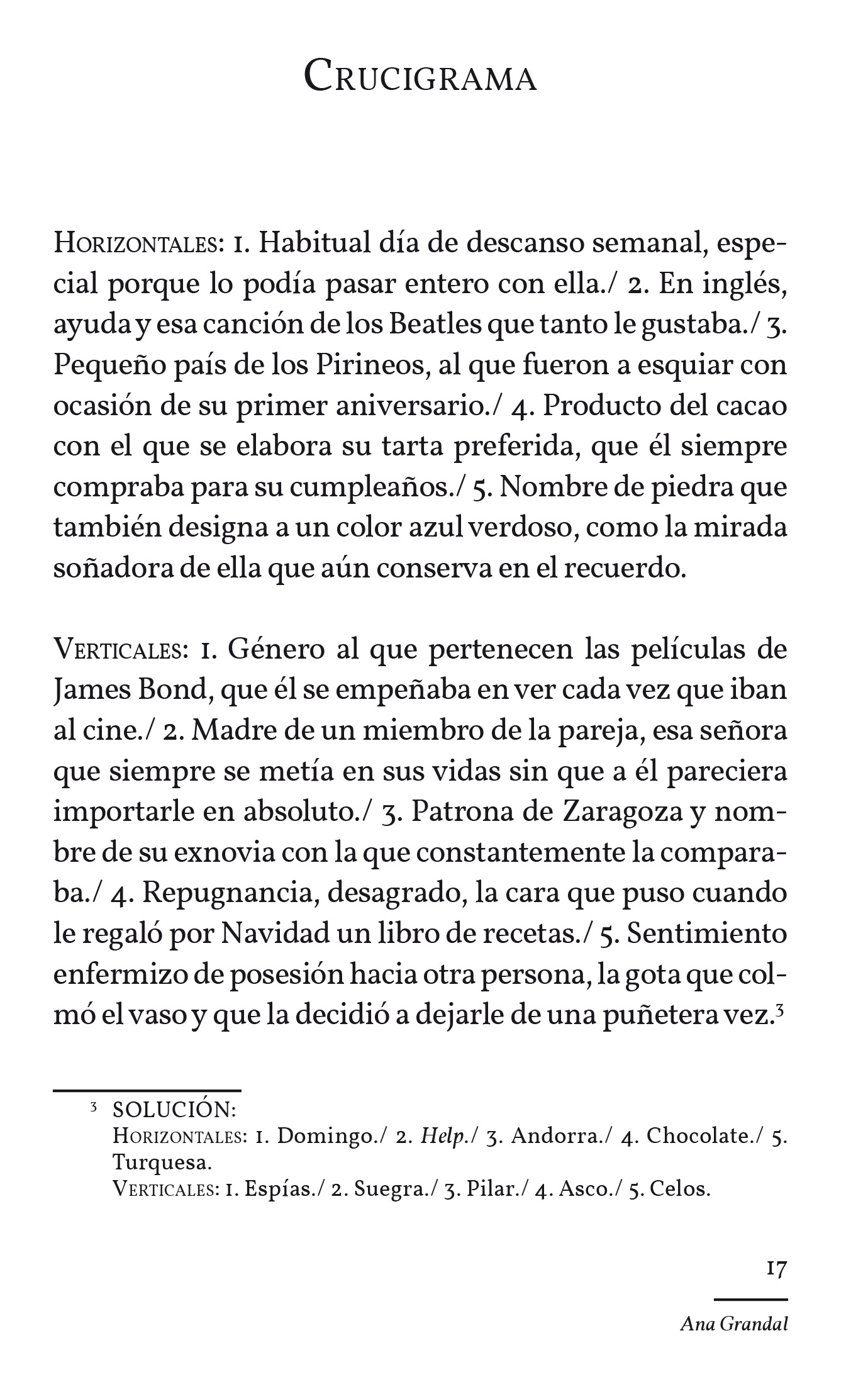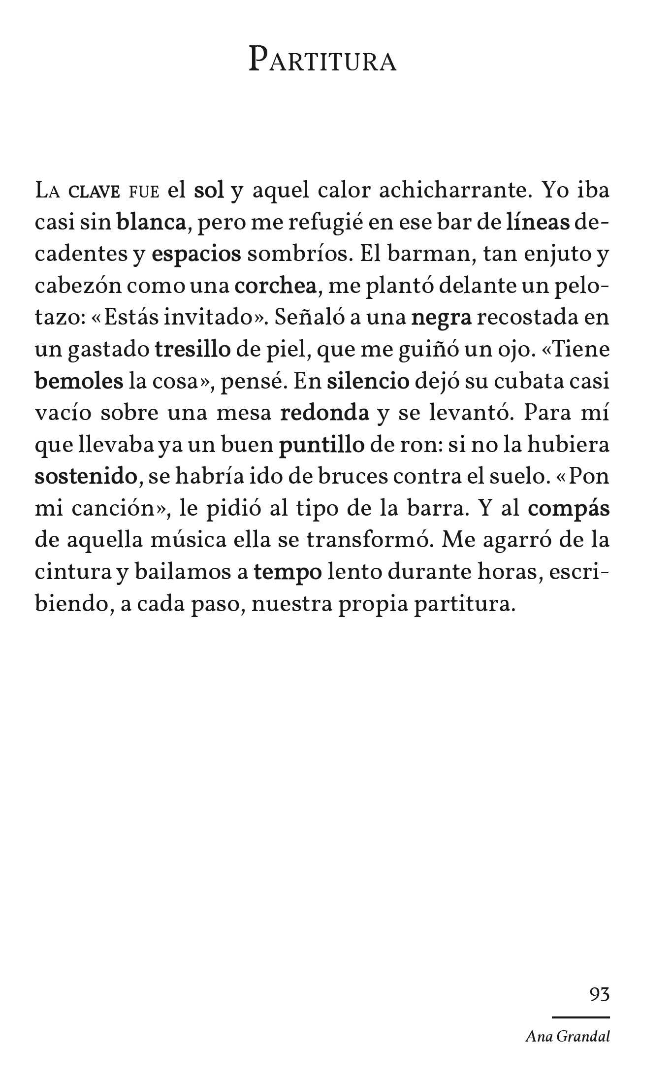 Ana Grandal es experta en construir trampantojos literarios. La sintaxis de Grandal otorga apariencia de realidad a lo que, en el fondo, es otra cosa: algo que el lector desvelará apartando la cortina que esconde el secreto. El trampantojo funciona como la sombra de una verdad oculta. Pero el juego de Grandal, como en Parrasio, va más allá del engaño; sus trampantojos tienen algo de perverso. La perversión, según Jacques Lacan, no se define por lo que hace el pervertido (sus extrañas prácticas sexuales) sino por la relación formal, indirecta, que establece con la verdad y la palabra. La estructura formal de los trampantojos de Ana Grandal es similar, pues oculta una verdad tras ella y, a la vez, ella misma constituye un engaño. Es mimética con lo que oculta. Con sus imágenes verbales y sus referentes culturales, Grandal imita algunos rasgos de la verdad, justamente aquellos que llevan al lector a intuir lo que parece ocultarse tras ellos. Como en el caso de Parrasio, Grandal no imita las uvas, sino el velo, la cortina que sugiere que hay algo oculto allí detrás. De tal manera que será la mente (perversa) del lector quien descubra el secreto, en tanto que, en el fondo, está familiarizado con él.
